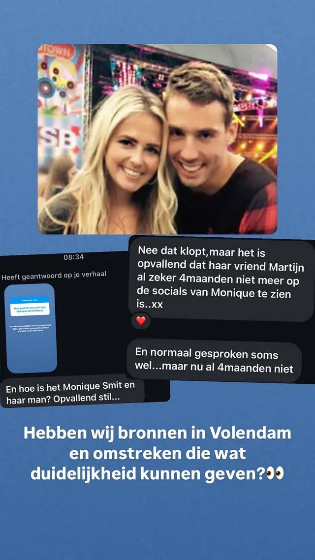 De plotselinge verdwijning van Martijn op Monique’s sociale media zorgt voor geruchten. Zijn ze nog samen? Is er iets gebeurd? Of is het gewoon een bewuste keuze om privé te blijven? Het blijft gissen, maar dat het stil is, staat vast. Monique heeft zelf nog niks laten weten. Geen statement, geen subtiele hints, geen uitleg. En dat voedt alleen maar meer vragen bij haar volgers.
