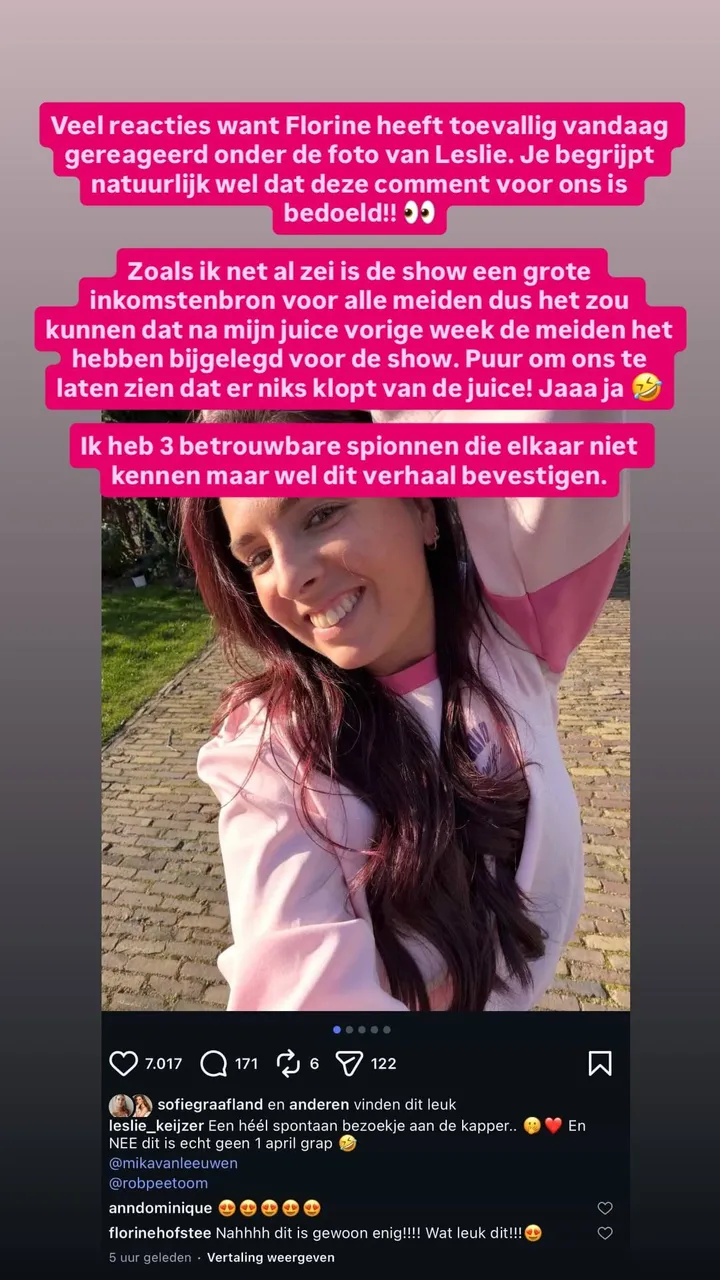 Wat de situatie extra interessant maakt, is dat Florine recent reageerde onder een post van Leslie. Dat zorgde voor veel reacties, omdat het leek alsof de lucht geklaard was.