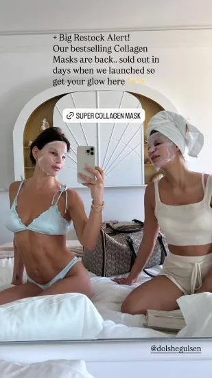 “Big restock alert! Our bestseller collagen masks are back.. sold out in days when we launched so get your glow here”, gevolgd door een link naar haar website. De boodschap is duidelijk: schoonheid is serious business, en marketing ook.