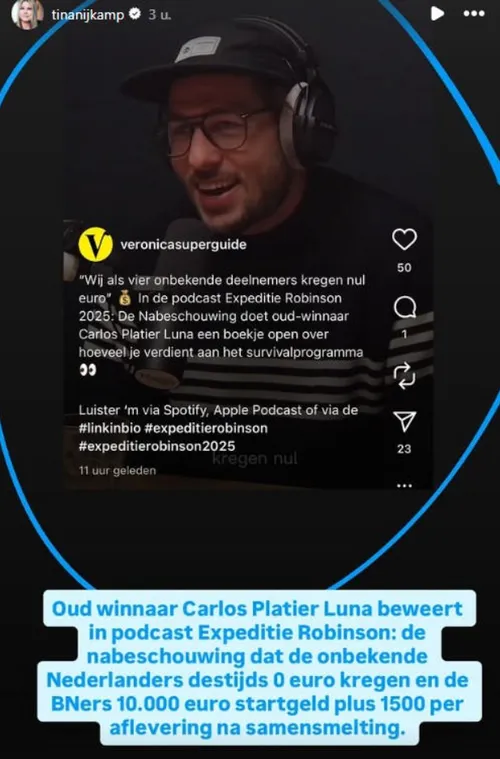 Expeditie Robinson-podcast van Veronica Superguide onthulde Carlos Platier Luna, voormalig winnaar en destijds geen BN’er, hoe groot het verschil is tussen bekende en onbekende deelnemers. BN’ers krijgen 10.000 euro startgeld en 1.500 euro per aflevering na een samensmelting. Niet-BN’ers, zoals Carlos zelf toen, krijgen helemaal niets! Volgens hem verklaart dit waarom sommige BN’ers er snel uit stappen: de startvergoeding is al binnen, die is lekker snel verdiend. Pas als je het écht langer op het eiland uithoudt kan het avontuur lucratiever worden.