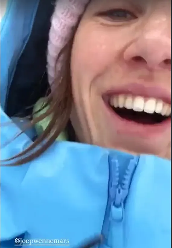 In plaats van boos te reageren, barst Suzanne in lachen uit. Met een brede glimlach probeert ze haar telefoon sneeuwvrij te maken. Ondertussen hoor je haar een beetje puffen, alsof ze zelf ook moet lachen om hoe onverwacht dit ging. Ze veegt het scherm schoon, controleert of alles het nog doet en kijkt lachend naar de camera.