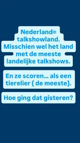 Tina Nijkamp doet wat ze altijd doet: elke ochtend de stand van tv-land publiceren. Ze is daarmee de onofficiële scheidsrechter van de talkshowoorlog, met dagelijks de vraag: wie pakt primetime, Eva (NPO 1) of Vandaag Inside (SBS6)? Nijkamp deelt die data openbaar via haar kanalen en werd daar eerder zelfs over aangesproken door het Nationaal Media Onderzoek, maar: ze mocht gewoon doorgaan. VI is meestal de te kloppen ploeg, maar Eva kruipt op