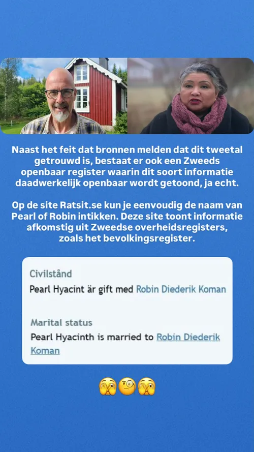 Zoals altijd zijn er mensen die niet kunnen wachten tot de finale en liever zelf rechercheur spelen. In een story die rondgaat (met screenshots erbij) wordt gesteld dat bronnen al meldden dat Pearl en Robin getrouwd zijn, maar dat er ook iets zou zijn dat het “hard” maakt: een openbaar register waarin dit soort informatie zichtbaar zou zijn. Op de screenshot die rondgaat, staat letterlijk een melding waarin Pearl als “married to” Robin wordt weergegeven. Dat is natuurlijk precies het soort bewijs waar roddelaccounts van gaan watertanden.