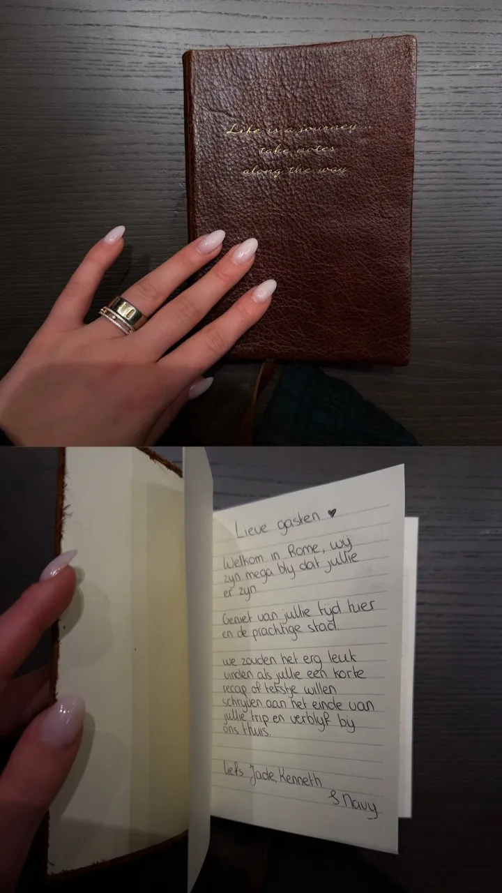 En precies daarom valt zo’n gastenboek meteen op. Het oogt als iets wat je bij verhuur verwacht, maar blijkt in werkelijkheid een persoonlijke manier om herinneringen vast te leggen van mensen die hen in Rome komen opzoeken.