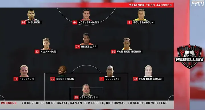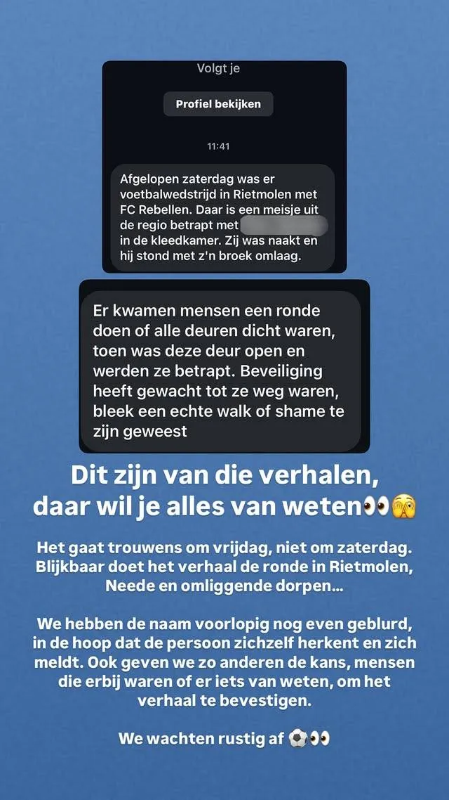 Na afloop vond er een opmerkelijk incident plaats. Volgens een verhaal dat inmiddels rondgaat op sociale media, werd één van de Rebellen-spelers betrapt in de kleedkamer met een volledig naakte vrouw. De beveiliging zou tijdens een controlerondje toevallig de kleedkamerdeur op een kier hebben aangetroffen, waarna het tweetal in een compromitterende situatie werd aangetroffen. De vrouw bleek een bezoeker uit de regio. Volgens de bron droeg zij geen kleding, terwijl de oud-voetballer nog deels ontkleed was. Beiden moesten daarop de ruimte verlaten onder het toeziend oog van omstanders. Die 'walk of shame' heeft inmiddels voor veel gespreksstof gezorgd. Maar wie was dit FC Rebellen-teamlid?