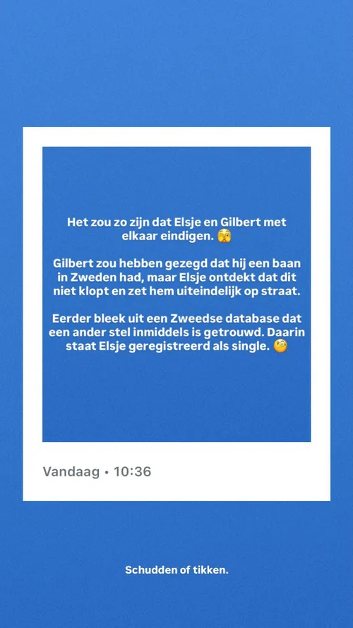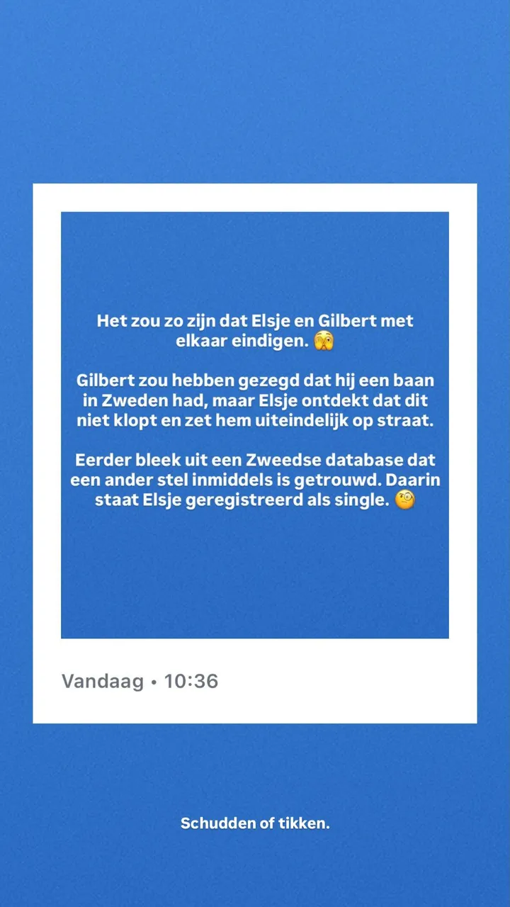 Alsof dat nog niet genoeg is, komt er ook nog een “bewijsachtig” stukje bij kijken. Eerder bleek namelijk uit een Zweedse database dat een ander stel inmiddels getrouwd zou zijn. En daarin zou Elsje juist geregistreerd staan als single. En ja, dat is natuurlijk precies het soort detail waar roddelaccounts heerlijk op gaan.