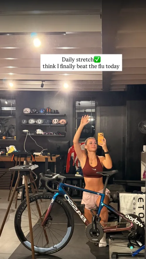 De afgelopen tijd was niet makkelijk voor Puck. Ze werd eerder geopereerd aan een vernauwde bekkenslagader, een serieuze ingreep die grote impact heeft op een wielercarrière. Zo’n herstel vraagt niet alleen fysiek veel, maar ook mentaal. Dat ze nu weer aan het stretchen en trainen is, laat zien dat ze stap voor stap terugkomt. Het blijft zoeken naar balans tussen rust en opbouw.