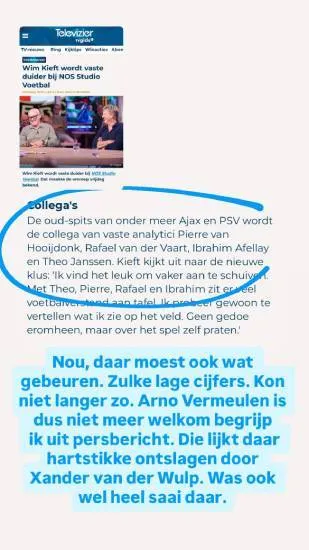 Tina Nijkamp viel nog iets op: Arno Vermeulen, jaren hét gezicht van de NOS-commentatoren en veelvuldig tafelgast, staat níét meer op de opstelling. In haar duiding noemt ze het alsof hij “hartstikke ontslagen” is bij Studio