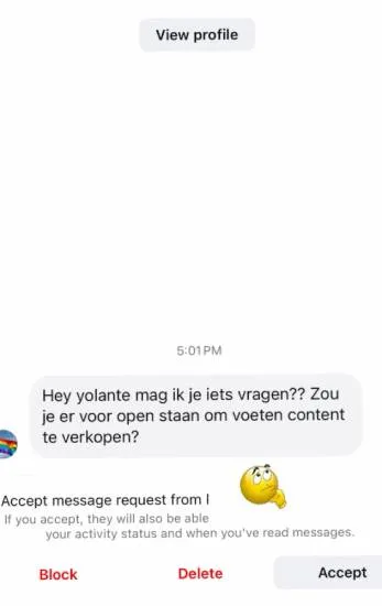 In haar story verscheen een screenshot van een DM van een onbekende volger met de vraag of ze openstaat om voetfoto’s te verkopen. Keurig geformuleerd, beleefd zelfs, maar ja, nog steeds nogal vreemd. De afzender tikt zijn verzoek alsof hij een offerte aanvraagt: netjes, vriendelijk, zonder scheldwoorden: gewoon een zakelijke vraag. Yolanthe zette er in haar story een denk-emoji bij. Niet omdat ze het serieus lijkt te overwegen, maar omdat het verzoek zó buiten de lijntjes kleurt dat je bijna niet weet hoe je moet reageren. De emoji zegt alles: wat móét ik hiermee?