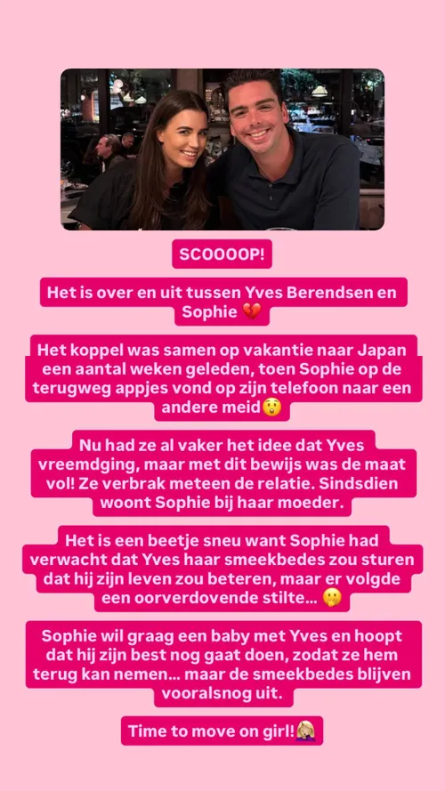 Hoewel de breuk bevestigd is, blijft het onduidelijk wat er precies is gebeurd. De verhalen over appjes en andere vrouwen zorgen voor veel speculatie, maar harde bevestiging ontbreekt. Wat wel zeker is, is dat een lange relatie ten einde is gekomen. Of Yves en Sophie in de toekomst nog op een andere manier contact houden, is nog maar de vraag.